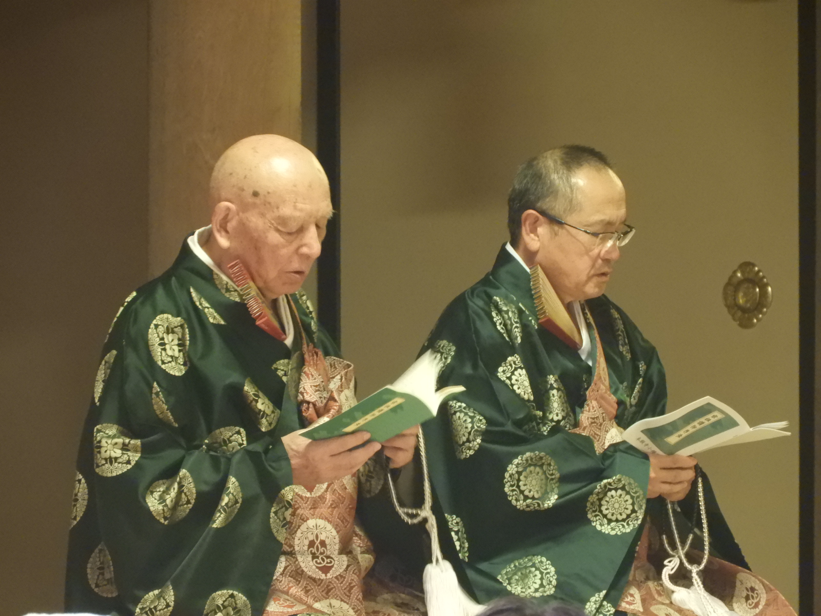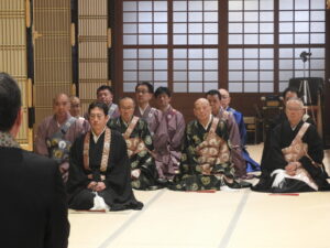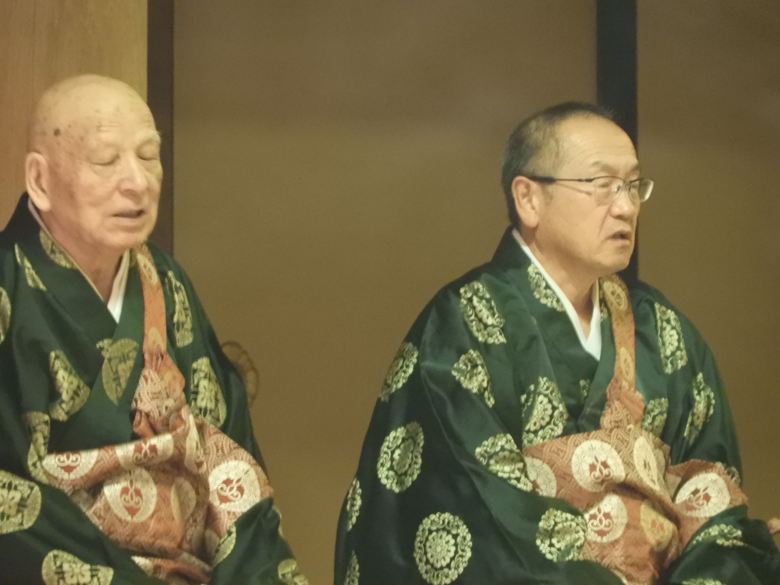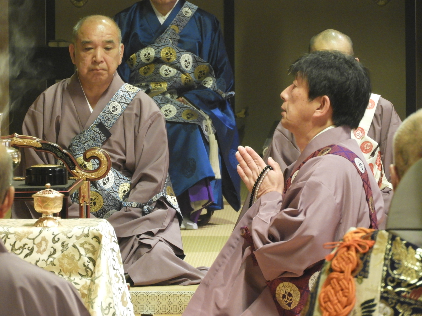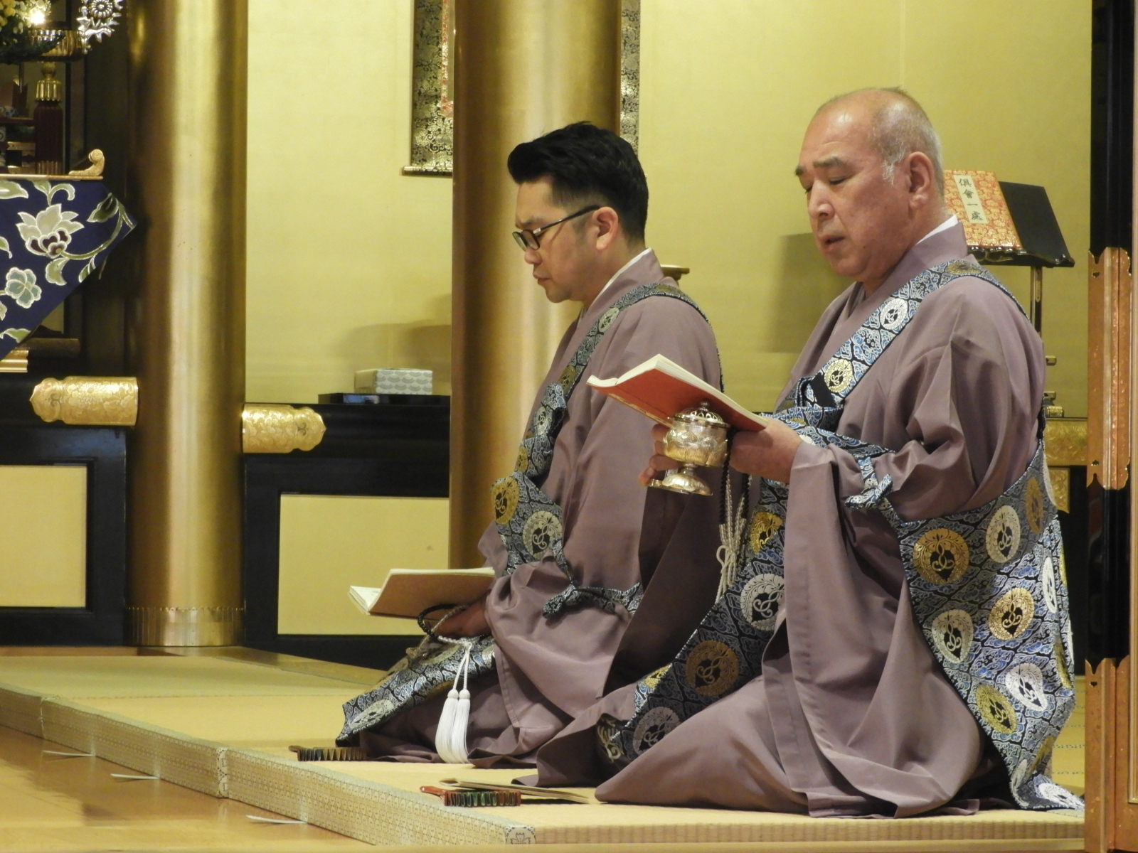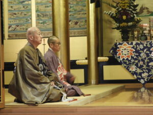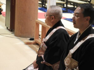 左:留萌 信楽寺様 右:後志 本念寺様                                                                                輪番がここに座っているのは登礼盤(とうらいばん)をする前?の画像でしょうか                                                                                  ※登礼盤(とうらいばん)とは、法要で雅楽の演奏に合わせて輪番が正面の礼盤に移り座ること。