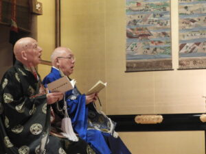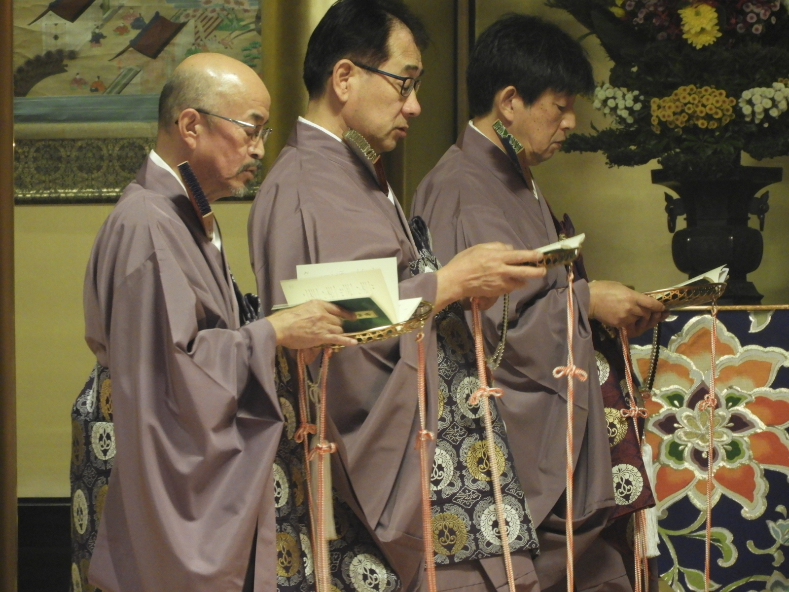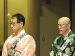 御文章(ごぶんしょう)拝読       会係(えがかり:法要を仕切る方々)                                                                                          拝読者:本川輪番            左:後志 龍渓寺様・右:後志 正行寺様