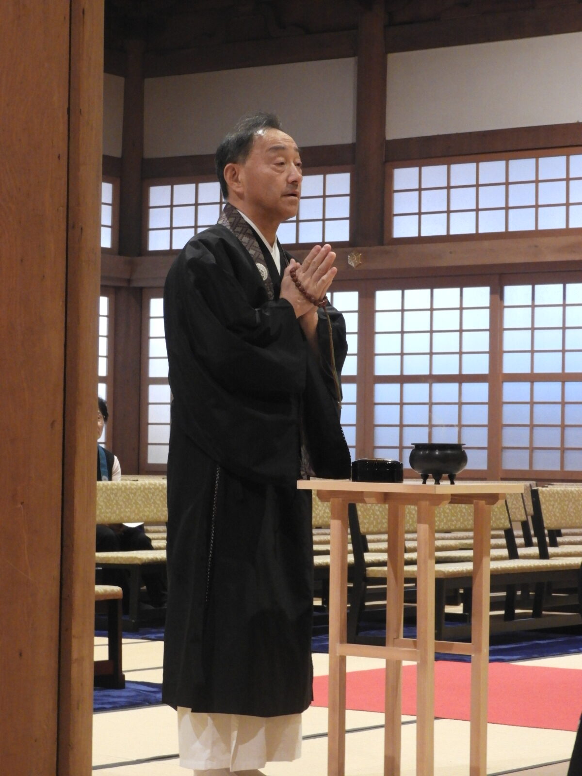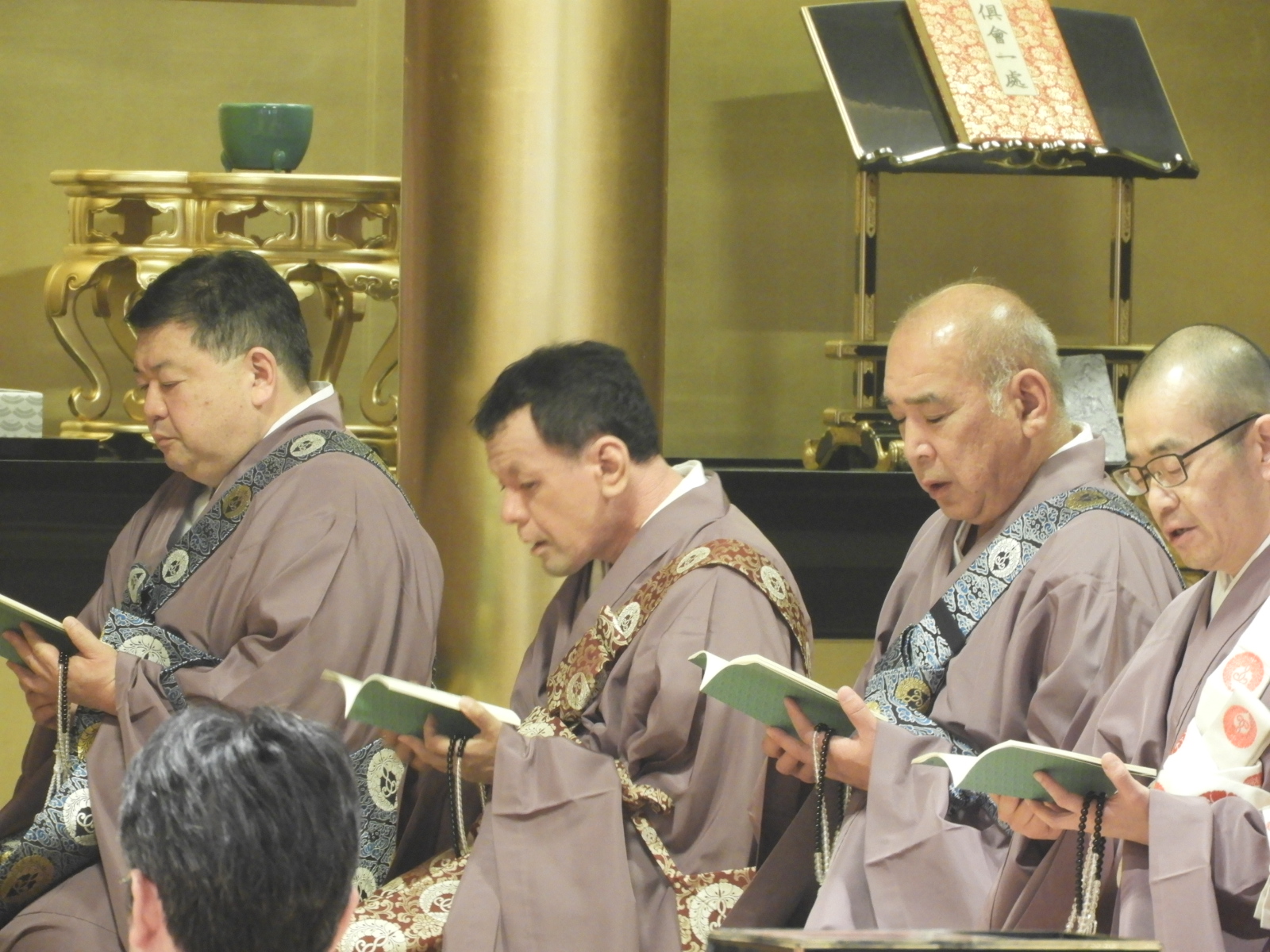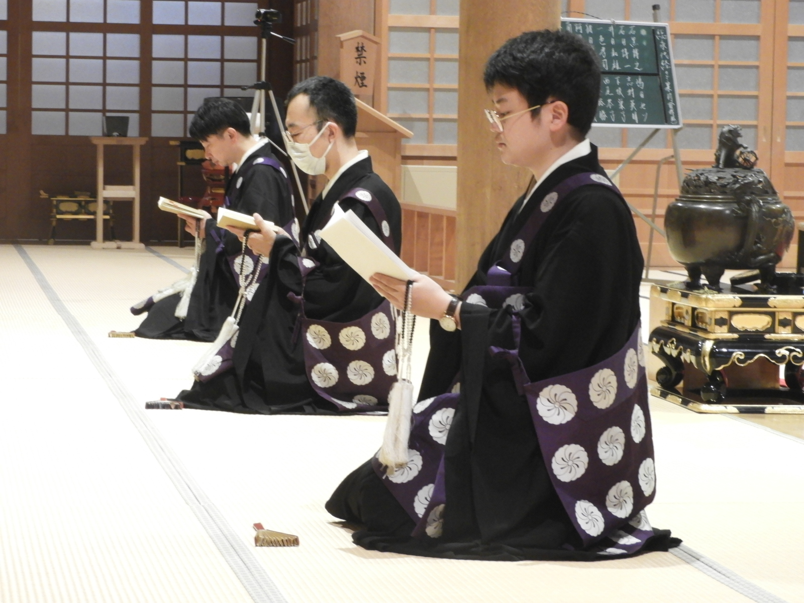 事件です!ご法中の人数が足りません・・・  本来、お晨朝の内陣(ないじん)のご法中は、おつと                                                  めの関係で少なくとも5人出勤いただきます。しかし、今回の内陣出勤は3人なので、どうしても2人                                                    足りません。                                                                                             そこで、別院の職員2人が出勤することになりました。                                                                内陣出勤