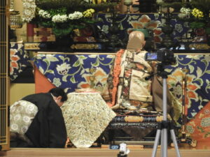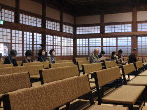 ※「御伝鈔」とは、宗祖親鸞(しゅうそ しんらんしょうにん)のご一生を、上巻と下巻に分けて拝読します。本来は上巻と下巻を続けて拝読しますが、当別院では13日に上巻、14日に下巻を拝読しています。拝読者は、別院僧侶職員の西村さんです。