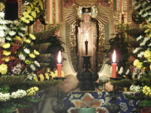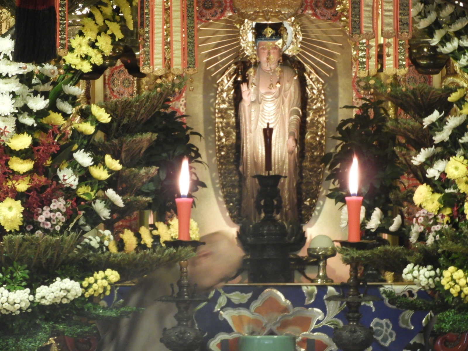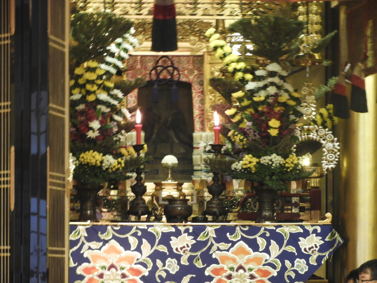 法要の始まりを、予感させるような画像です。私が撮ったものではありません(西脇さんです)                                                        でも、実は法要前の仏飯上供(ぶっぱんじょうぐ:お仏飯をお供えすること)をしたところの画像で、左画像の左のロウソクの下に本川輪番の頭がブレて写っています。(お気づきになりましたか?)