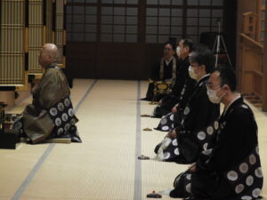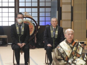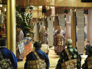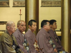 中央:杉本責任役員・総代        先頭:花岡尚樹(はなおか なおき)師                                                                      左 :岩山総代             満日中に出勤さてたご法中の方々