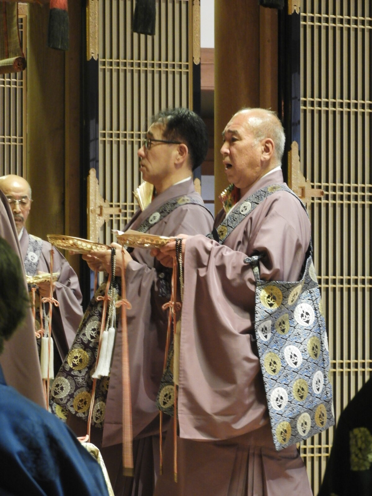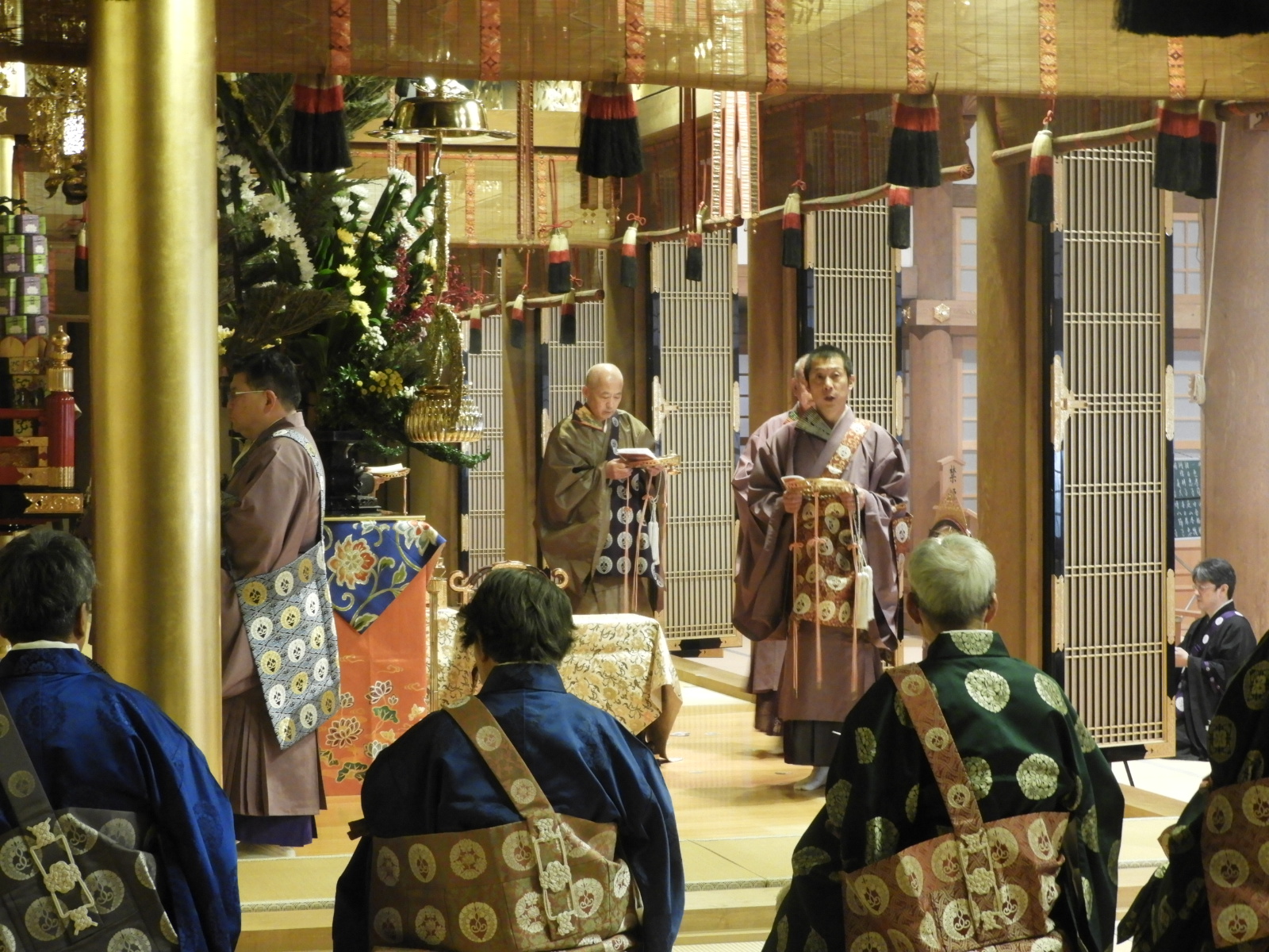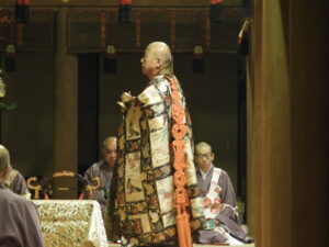 報恩講最後の法要なので、輪番のお袈裟(けさ)が違います。                                                                      今までのお袈裟は五条袈裟(ごじょうげさ)を着用していましたが、満日中は七條袈裟(しちじょうげさ)を着用します。(画像を比較してみてください)
