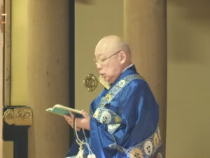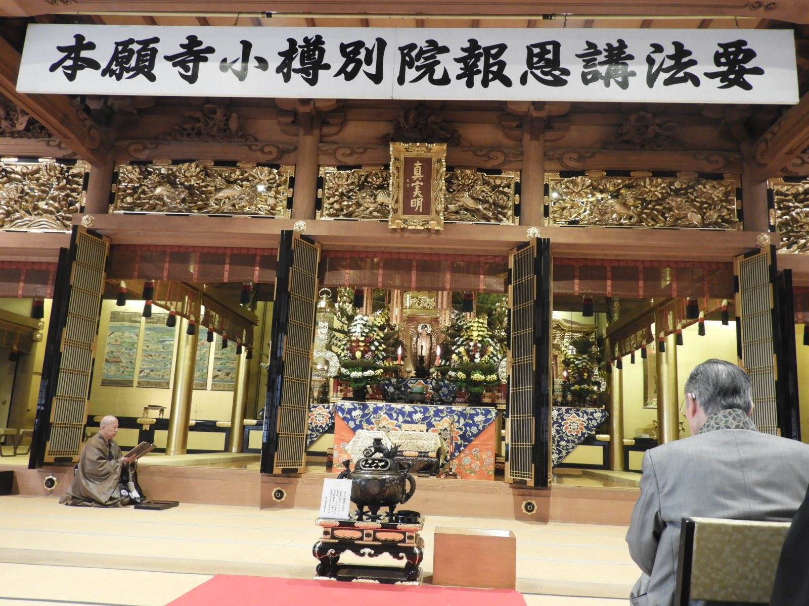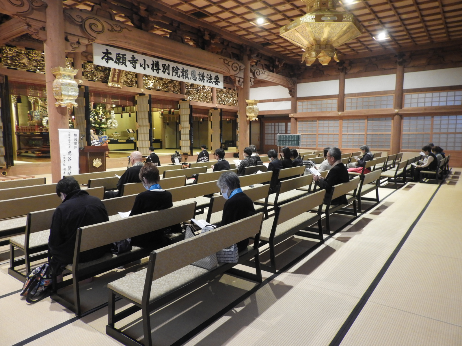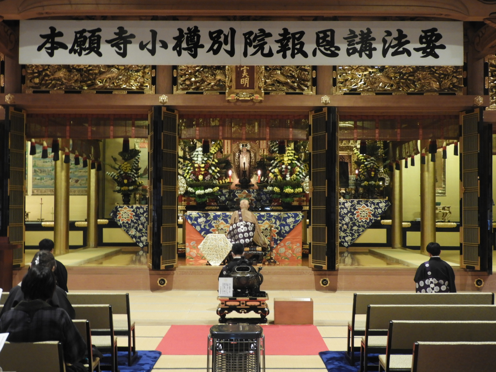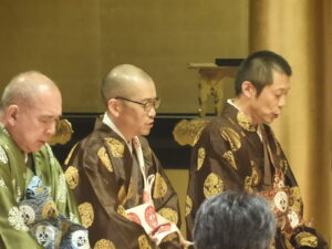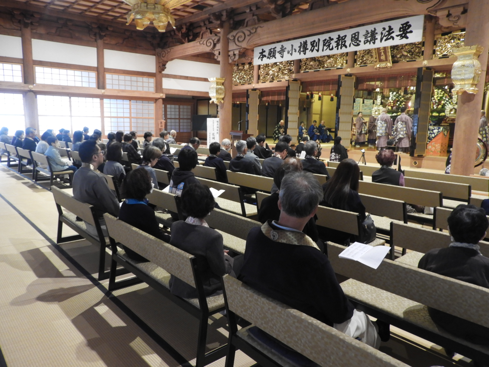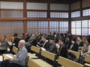 法要が終わりましたら、御礼言上を行います。ご本山では、後堂(うしろどう:本堂の裏)で行われる                                                   と聞いたことがあります。                                                                                    また、先日お伺いした量徳寺様は、ご法中(ほっちゅう:出勤されるお寺さん方)の控室で行われまし                                                       た。                                                                                               ※御礼言上は、ご法中の方々が小樽別院報恩講をつとめさせていただいたことを輪番に伝え、輪番はご                                                   法中の方々にお礼を申しあげます。その後、ご本山に報恩講がつとまったことをご報告いたします。御礼                                                  言上が終わりましたら、輪番がご参拝のご門徒の方々にお礼を申しあげます。                                                               そして、花岡尚樹(はなおか なおき)師によります別院報恩講最後のご法話があって、令和7年度本願                                                  寺小樽別院報恩講の全日程が終了いたします。                                                                                                      お参りは12名(寂しい・・・)