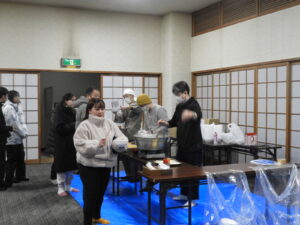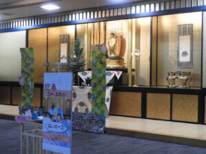 除夜の鐘と同時に、ホールにて別院名物 年越し蕎麦屋の開店!!! 蕎麦屋の大将:別院僧侶職員の森さん 従業員:別院僧侶職員の西村さんと西脇さん ホールの阿弥陀様前には、小樽幼稚園の先生方作のフォトスポットを設置。 皆さん、記念写真パシャパシャで大盛況!!!