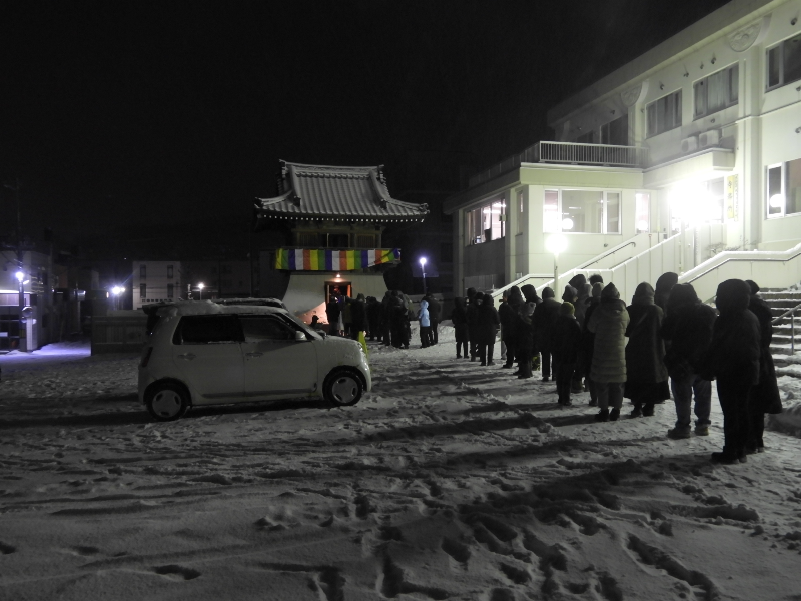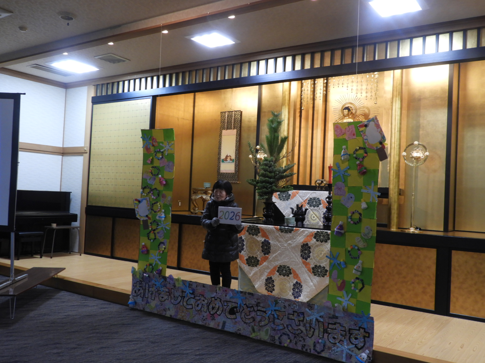 除夜の鐘と同時に、ホールにて別院名物 年越し蕎麦屋の開店!!! 蕎麦屋の大将:別院僧侶職員の森さん 従業員:別院僧侶職員の西村さんと西脇さん ホールの阿弥陀様前には、小樽幼稚園の先生方作のフォトスポットを設置。 皆さん、記念写真パシャパシャで大盛況!!!