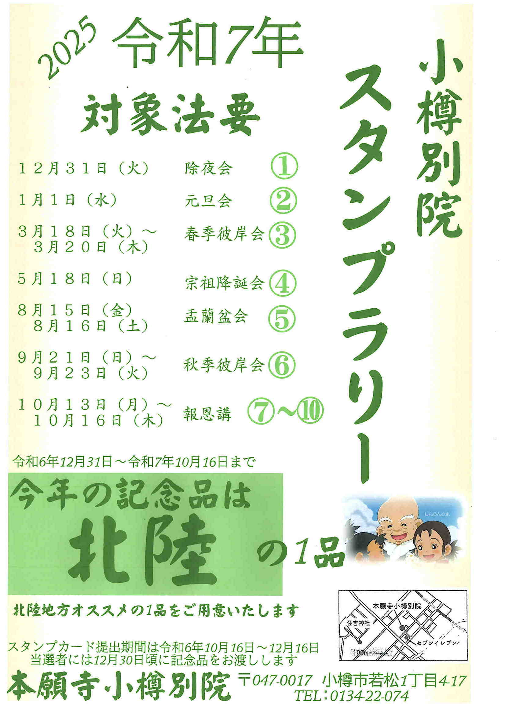 2019年5月19日 / 最終更新日 : 2024年12月27日 小樽別院-WP管理人 日記 本願寺小樽別院法要参拝スタンプ・ラリーのご案内 令和7年「法要参拝スタンプラリー」を実施いたします。 小樽別院の恒例法要に参拝し、スタンプを集めましょう。 スタンプカードは本堂にございますのでご自由にお取りください。